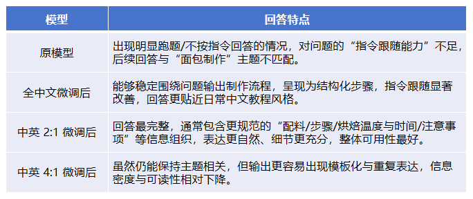 从定性对话效果看,微调整体显著提升了指令跟随与回答相关性;其中 中英 2:1 的回答结构更完整、表达更自然。