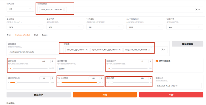 完成三组微调训练后,进入 LLaMA-Factory 的 “Evaluate & Predict” 页面进行模型评估。