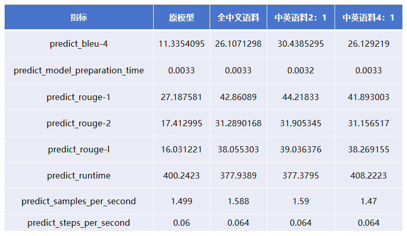 • 综合最优出现在“中英 2:1”:中英 2:1 在 BLEU-4、ROUGE-1/2/L 上均为最高,整体表现最佳。