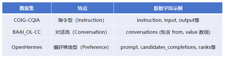 为了喂饱这个 2B 的“小胃王”,我们选择了以下三类数据集,涵盖了从地道中文表达、海量通用知识到逻辑编程能力的方方面面: