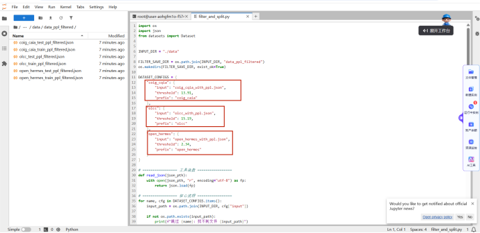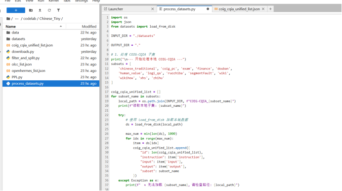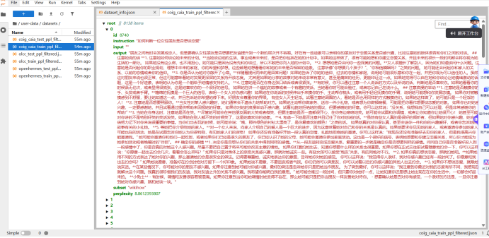 新建实例JupyterLab或VSCode,由于数据处理后期需要使用Qwen模型计算困惑度,建议选择1卡GPU,使用代码下载数据,共三个数据集。它们的原始数据形态差异较大: