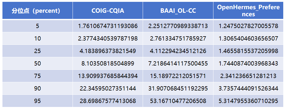 可以直观看到:OpenHermes 的整体 PPL 显著更低,说明文本更自然、更“模型友好”;而 COIG 与 OL-CC 在高分位(90%/95%)区间 PPL 拉升明显,往往对应更重的噪声与非自然片段。