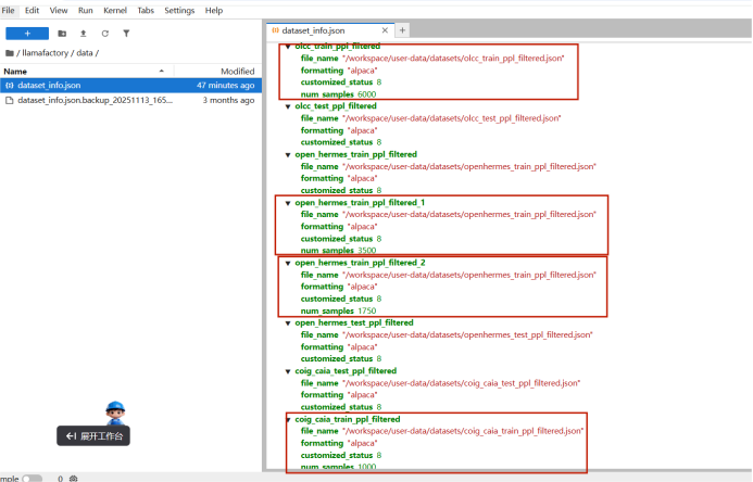 清洗后的数据导出为 Alpaca JSON 文件后,最后一步是把数据注册到 llamafactory/data/dataset_info.json 中,并在训练配置里按预设比例进行混合采样。