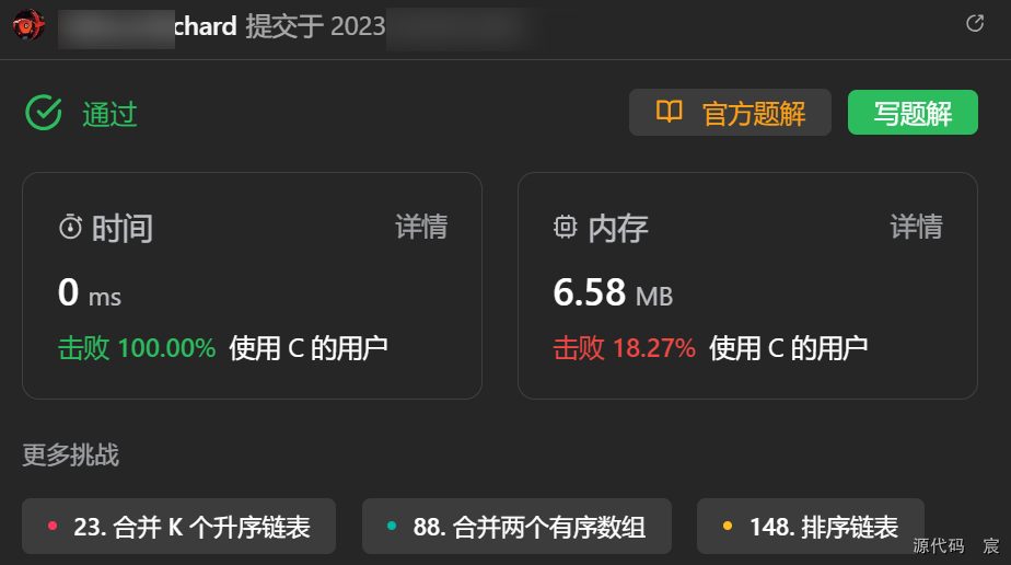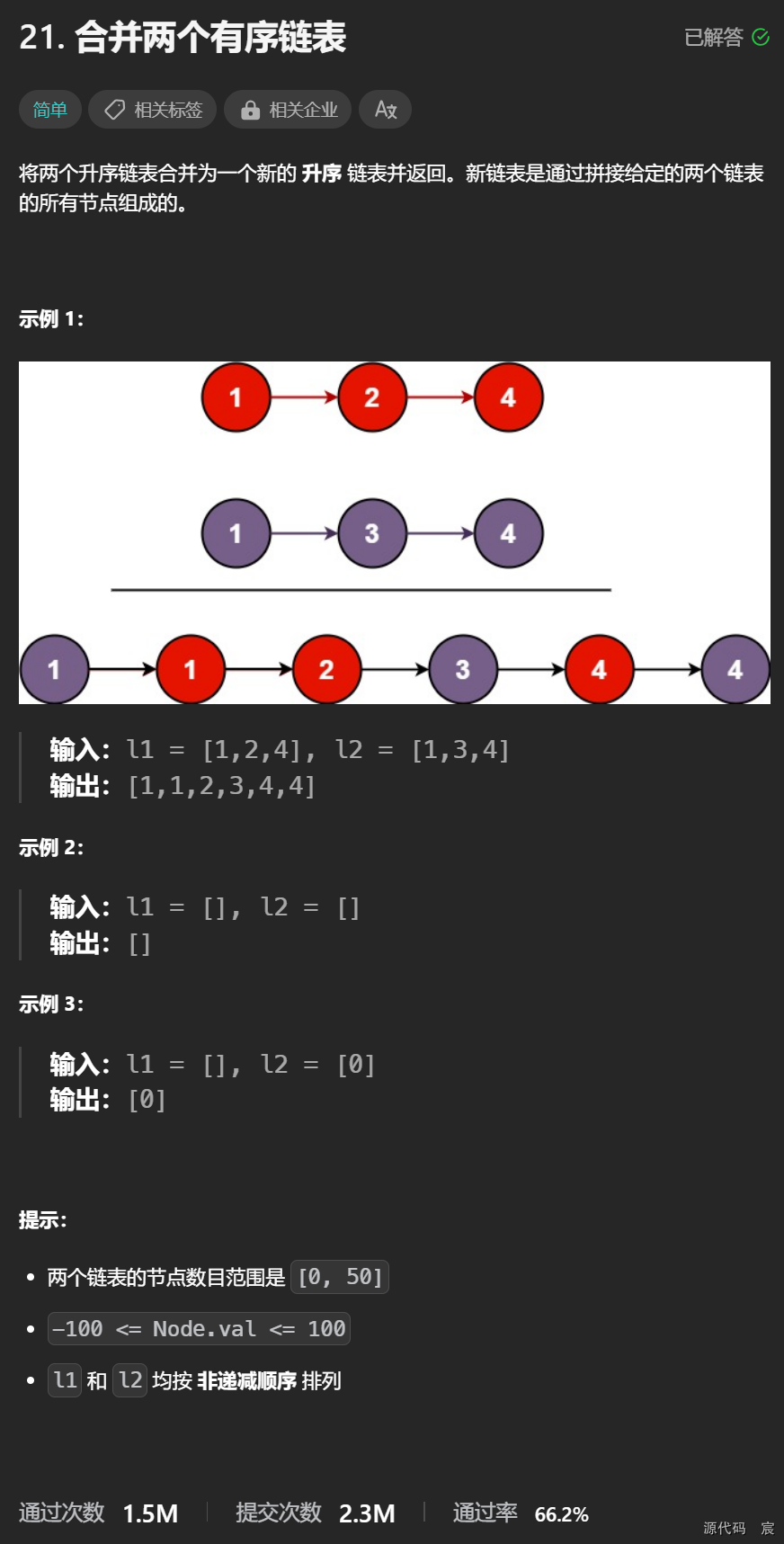 struct ListNode* mergeTwoLists(struct ListNode* list1, struct ListNode* list2){struct ListNode *p1, *p2, *p3;p1 = list1;p2 = list2;p3 = (struct ListNode *)malloc(sizeof(struct ListNode));struct ListNode *pc = p3;while(p1 && p2) {if(p1->val <= p2->val) {pc->next = p1;pc = p1;p1 = p1->next;} else {pc->next = p2;pc = p2;p2 = p2->next;}}pc->next = p1 ? p1 : p2;return p3->next;