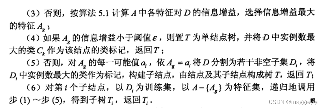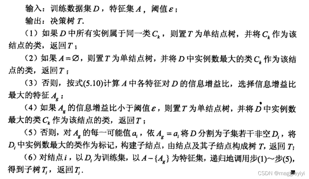ID3算法的核心是在决策树上各个结点上应用信息增益准则选择特征,递归地构建决策树。
