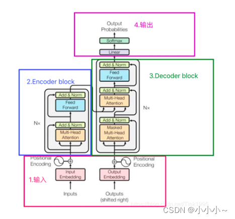 Decoder block。一个decoder由Masked Multi-Head Attention、Multi-Head Attention 和 全连接神经网络FNN构成。比Encoder多了一个Masked Multi-Head Attention,其他的结构与encoder相同,这里重点介绍一下Masked Multi-Head Attention。