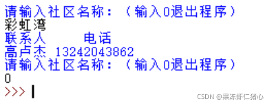 a = list(arr)while(1): t = input('请输入社区名称:(输入0退出程序)' + '\n')if t == '0':sys.exit(0)for i in range(0,len(a)):if(t == a[i][1]):print("联系人 电话")print(a[i][2]," ",a[i][3])c.close()