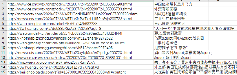 C:\素材文件夹中h.txt为已爬取的某新闻网站的静态html文本文件,其中新闻链接和标题的呈现特点是“<a href="http开头的地址" mon="ct=1&a=2&c=top&pn=1-2位数字" target="_blank">标题</a>”,请利用正则方法,筛选其中新闻链接和标题,保存在C:\KS\news.csv(结果示例如图),程序保存在C:\KS目录下,名为 4_5.py。