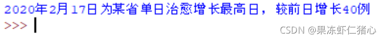 请编写程序,找出单日治愈例数增长最高日期,若有并列最高增长日,则选择并列的最后一日。 运行结果如图所示,按图示的格式输出结果。程序保存在C:\KS目录下,名为4_1.py。