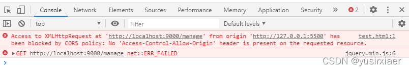 该前端页面用LiveServer 启动 http://127.0.0.1:5500/test.html ajax请求http://localhost:9000/manage 必然跨域