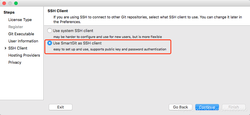 第四步:选择SSH Client,这里我选择让SmartGit作为客户端,点击继续