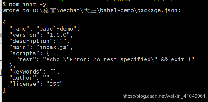 2.配置环境——创建项目文件babel-demo,进入项目后 git bash,然后输入 npm init -y,然后项目文件就会出现配置文件:package.json