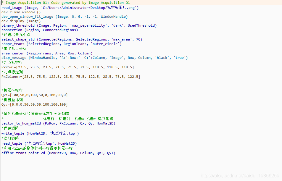 使用机械手将物体放在工作空间中的9个位置,分别用相机进行拍照,取得9个点的机械坐标和像素坐标,然后用Halcon提供的求得仿射矩阵HomMat2D