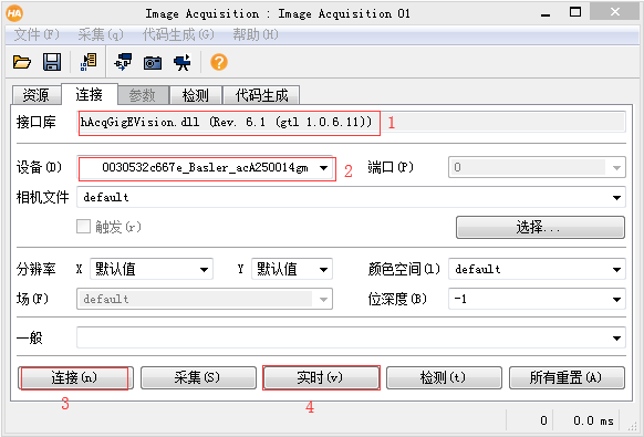 1框内是检查相机是否能够索引到,2框是看是否有图像,3框是检查帧率与带宽相机尺寸,4框是检查有无错误信息。