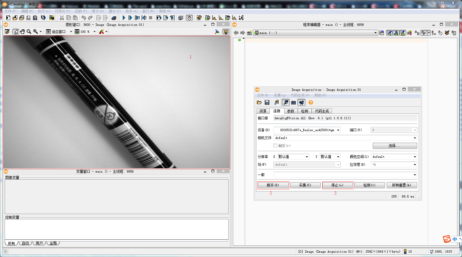 首先相机连接电脑,打开halcon,连接相机(这里不一定要连接相机,用相机照好的图片也可以)。