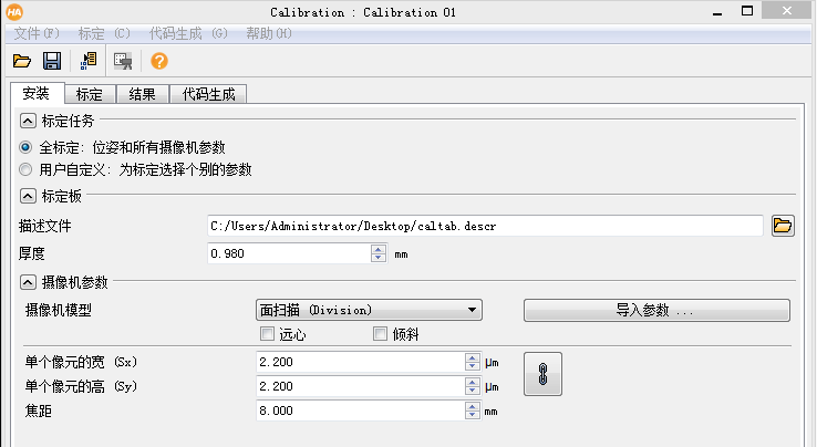 2.标定板的描述文件选择我们刚刚创建的描述文件。C:/Users/Administrator/Desktop/caltab.descr