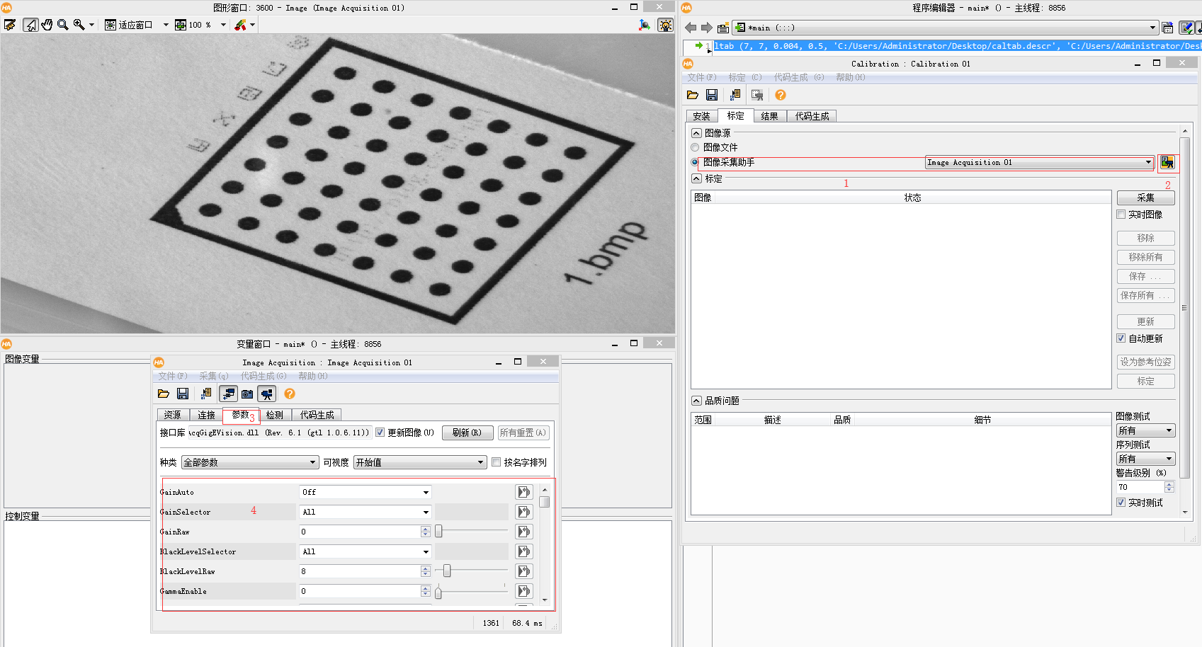 4点击图像采集助手里的参数,调整焦距,调整光源,让成像质量好一点。(不过曝、标定片黑色圆点与白色背景对比度大于100、对焦清晰)
