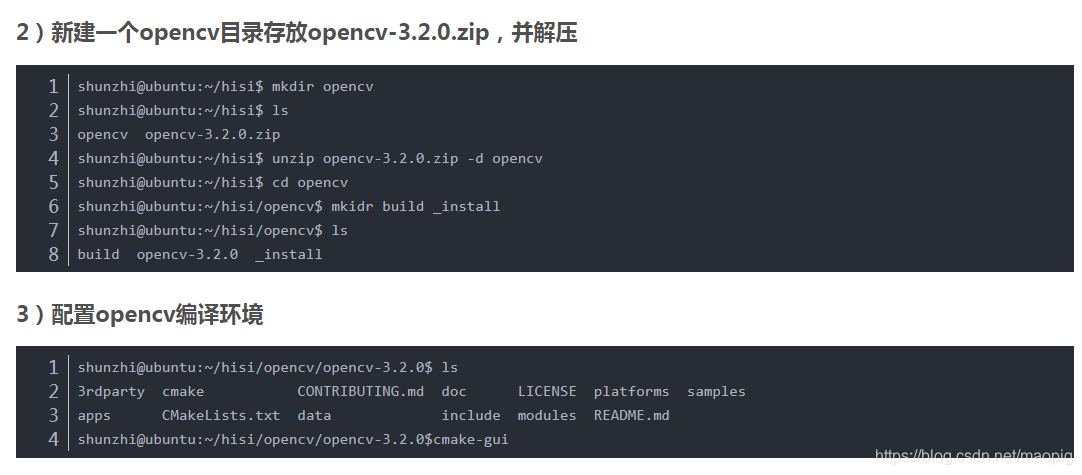 -  2)新建一个opencv目录存放opencv-3.2.0.zip,并解压