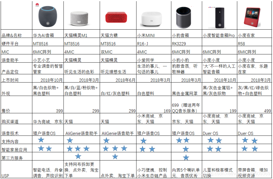 众所周知,2014年底,电商巨头亚马逊推出智能音箱产品Echo之后,引起市场的强烈反响。随后、谷歌、微软、苹果均开始布局智能音箱市场,国内公司以玲珑科技打头阵。2017年国内公司纷纷发布智能音箱,被称为智能音箱元年。经过一年多的厮杀,2018年依旧有不少玩家相继发布新品,现就今年发布的智能音箱做个简单对比,如下: