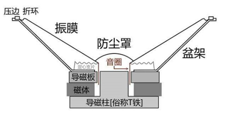 流过磁场内音圈的音频电流与永久磁场的相互作用会产生使锥盆轴向振动的力,