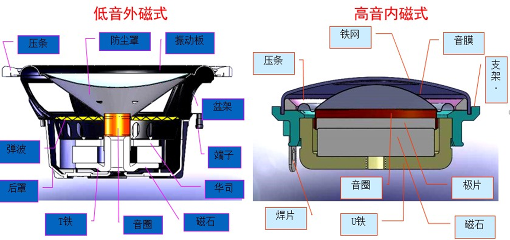 主要有锥体式和球顶式两种,各种不同功能的动圈式扬声器基本组件都一样:
