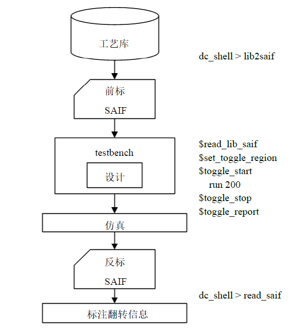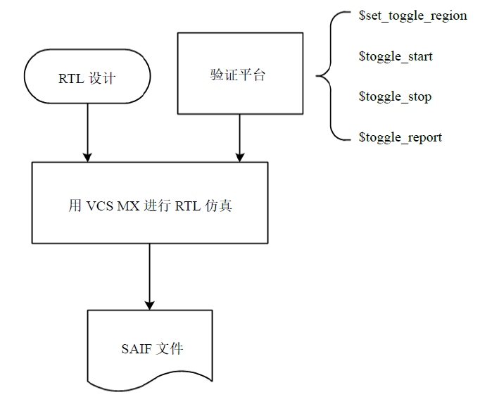如图所示为RTL仿真产生SAIF格式文件的流程图,只需在testbench里加$set_toggle_region, $toggle_start, $toggle_stop, $toggle_report这几个命令后再运行仿真程序即可。