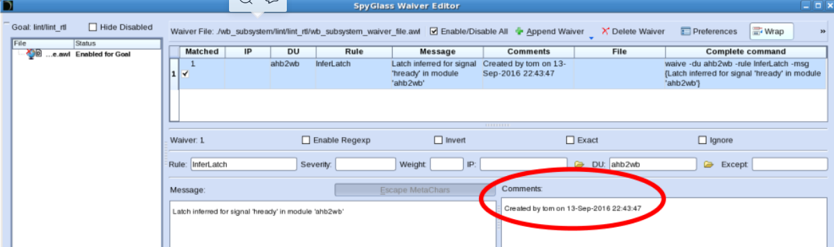 可以在Comments字段中添加放弃的原因。做出任何更改后,单击Apply。可以将Waiver设置保存为文件然后重复使用:在waivers编辑器窗口中右键点击左侧面板中文件,然后选择Save Waiver Files。 SpyGlass会为每个Goal保存一个关于检查过滤的文件。