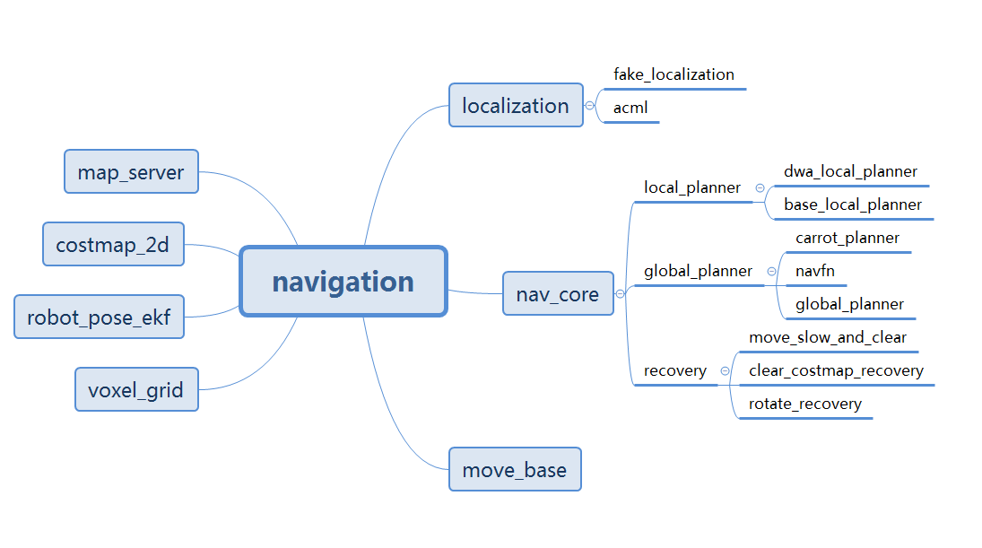 - nav_core:这里面只有三个文件,对应的是全局路径规划、局部路径规划、recovery_action的通用接口定义,具体功能实现则是在各个对应的规划器package里。