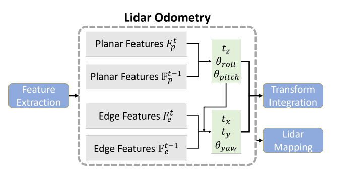 Lidar Odometry模块估计两次连续扫描之间的传感器运动。 通过执行point-edge和point-plane扫描匹配找到两次扫描之间的转换。具体方法采用的与LOAM中一致。但在后续步骤中,作者做了一些改进。