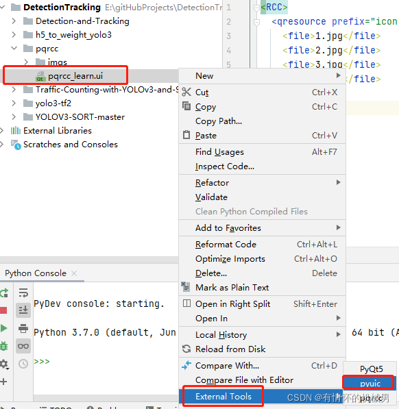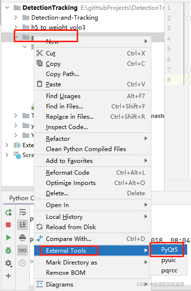 4、找到ui文件,右键--external tools--pyuic:将ui文件编译成py文件