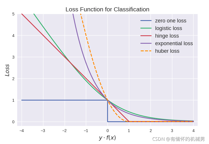 因此进行损失函数的选择的时候,一般取标签和超平面函数的乘积作为变量,常用的分类损失函数有0-1损失函数、hinge损失函数、对数损失函数,常用的是hinge函数,h = max(0,1-yf(x))