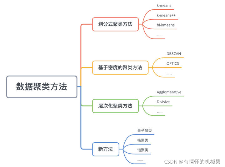 K-均值聚类、密度聚类(DBSCAN算法)、层次聚类、高斯混合聚类等