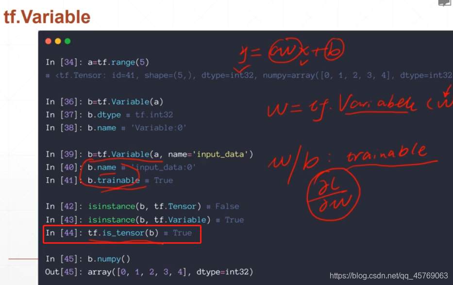 a = tf.range(4)#[0,1,2,3]b = tf.Variable(a,name = "变量名")b.nameb.trainable#返回True,表示是可以训练的变量,系统会自动对该变量的梯度进行监督(watch)