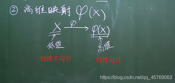 在非线性模型中寻找一条直线进行二元分类似乎已经不太适用(如上图找不到直线进行二元分类),但是通过映射,将低维的量映射到高维,即通过高维映射后,在高维空间中,更有可能线性可分进行二元分类。维度越高,线性可分的概率越大