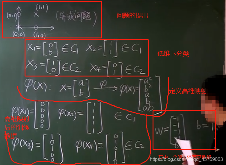 异或问题是最简单的非线性模型,在低维下没法找到一条直线将二元分类