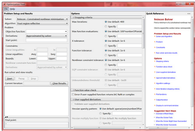 调用命令:在Command Window输入“optimtool”,其窗口如下