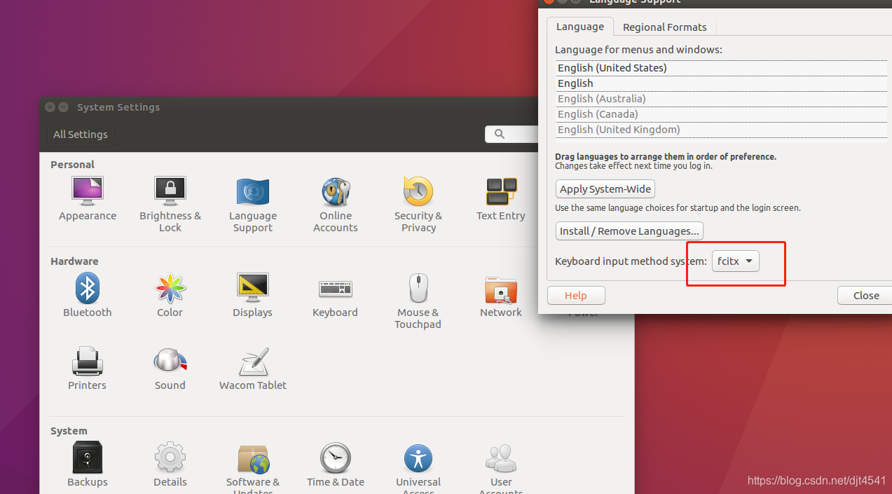 6、进入系统的System Setings 的Language Support中,讲IBus 改为fcitx