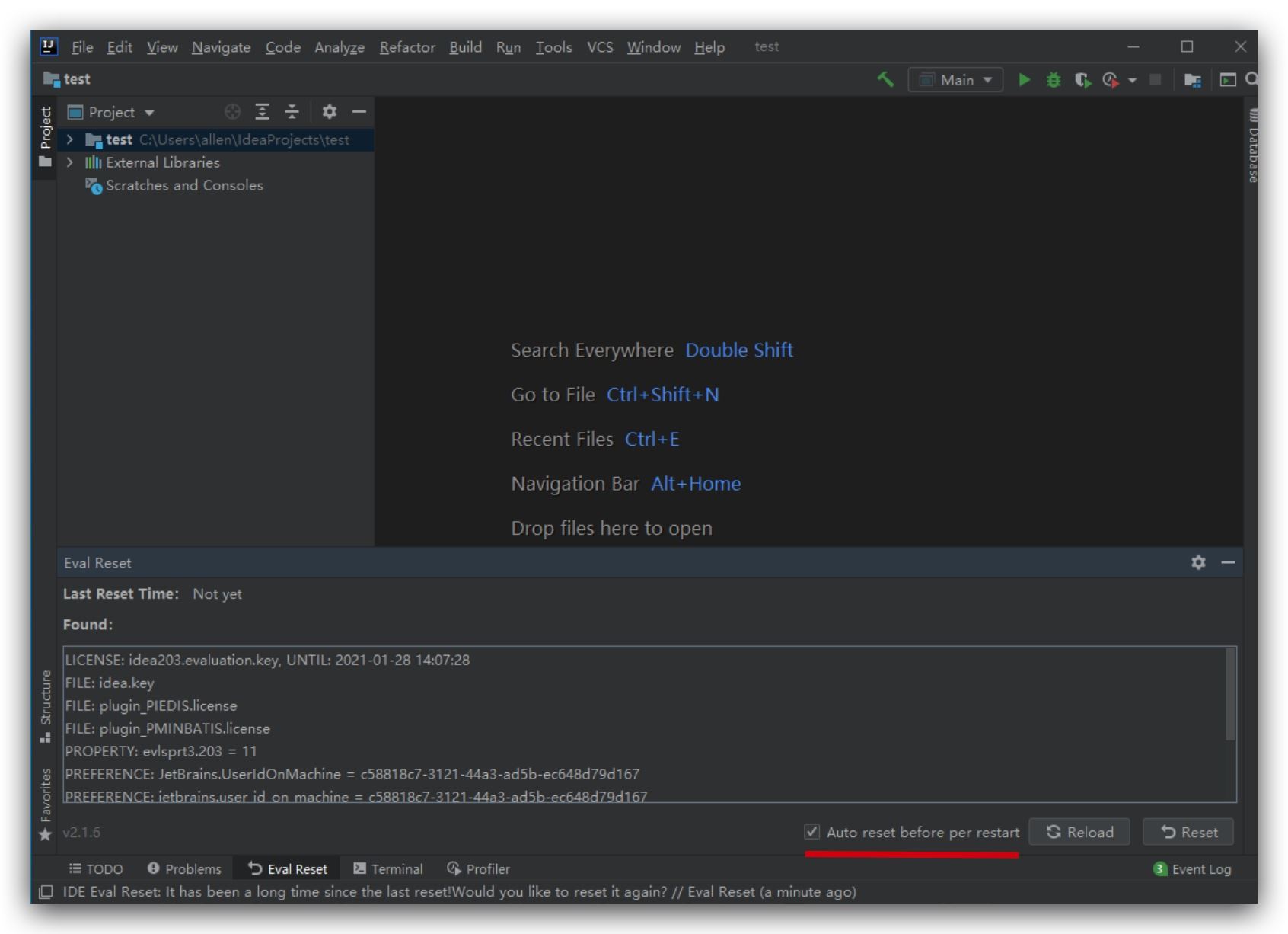如果IDE没有打开项目,在Welcome界面点击菜单:Get Help -> Eval Reset如果IDE打开了项目,点击菜单:Help -> Eval Reset