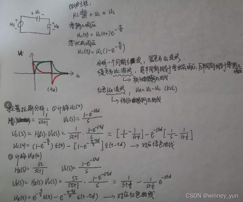 RC一阶电路为例进行时域和频域分析,激励Us为方波,以Uc作为输出的波形相当于积分电路的输出曲线,以Ur作为输出的波形相当于微分电路的输出曲线。电容对输入电压具有平滑作用,平滑程度与时间常数有关,衰减程度与带宽设计有关。下面分别从时域和频域两个方面进行分析。