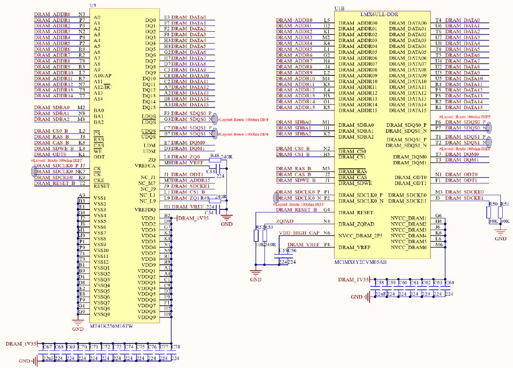 图23.4.1 中左侧是DDR3L 原理图,可以看出图中DDR3L 的型号为MT41K256M16TW,这个是镁光的512MB DDR3L。但是我们实际使用的512MB DDR3L 型号为NT5CC256M16EP-EK,不排除以后可能会更换DDR3L 型号,更换DDR3L 芯片是不需要修改PCB。图23.4.1 中右边的是I.MX6U 的MMDC 控制器IO。