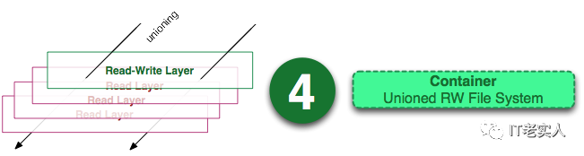 从左边我们看到了多个只读层,它们重叠在一起。除了最下面一层,其它层都会有一个指针指向下一层。这些层是 Docker 内部的实现细节,并且能够在主机的文件系统上访问到。统一文件系统 (unionfile system) 技术能够将不同的层整合成一个文件系统,为这些层提供了一个统一的视角,这样就隐藏了多层的存在,在用户的角度看来,只存在一个文件系统。我们可以在图片的右边看到这个视角的形式。