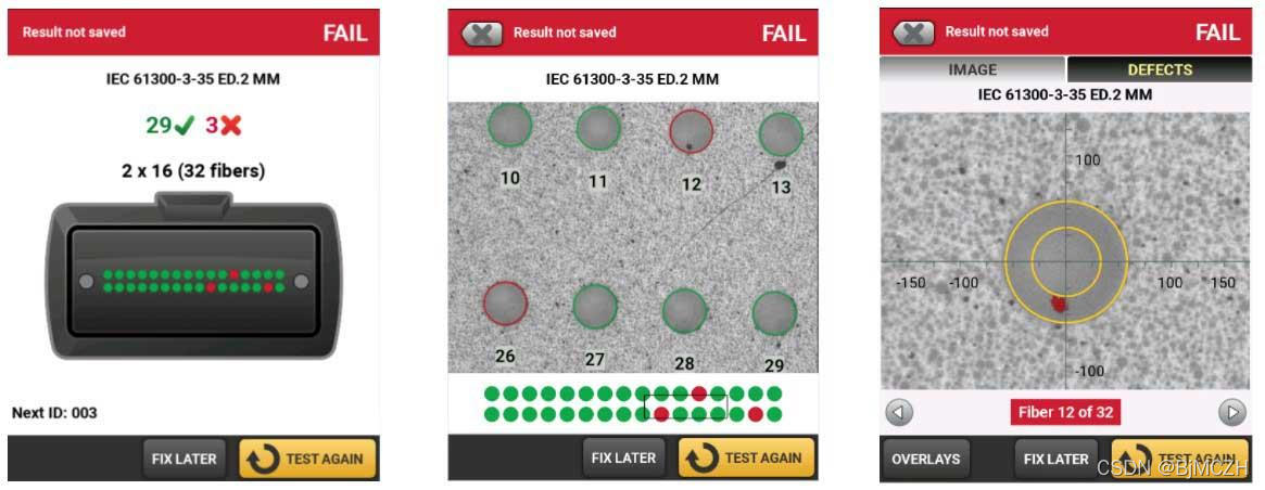 触摸自动对焦按钮,光纤光谱仪™ Ultra提供了光纤端面的实时清晰视图。如果您正在检查MPO,双摄像头可以让您查看单个光纤或整个阵列,只需放大您要查看的部分或点击屏幕即可获得特定光纤的详细特写视图。但最好的部分是,FiberInspector Ultra的自动测试模式根据IEC 61300-3-35标准的清洁度标准自动检查和分级端面,该标准根据划痕和缺陷的数量、大小和位置确定合格与否。