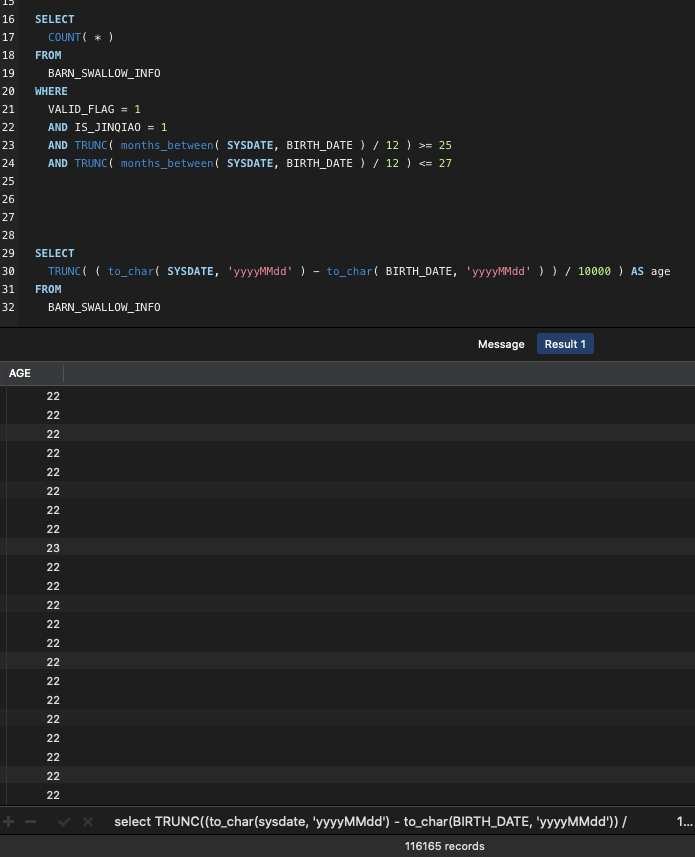 WHEREVALID_FLAG = 1 AND IS_JINQIAO = 1 AND TRUNC( months_between( SYSDATE, BIRTH_DATE ) / 12 ) >= 25 AND TRUNC( months_between( SYSDATE, BIRTH_DATE ) / 12 ) <= 27SELECTTRUNC( ( to_char( SYSDATE, 'yyyyMMdd' ) - to_char( BIRTH_DATE, 'yyyyMMdd' ) ) / 10000 ) AS age
