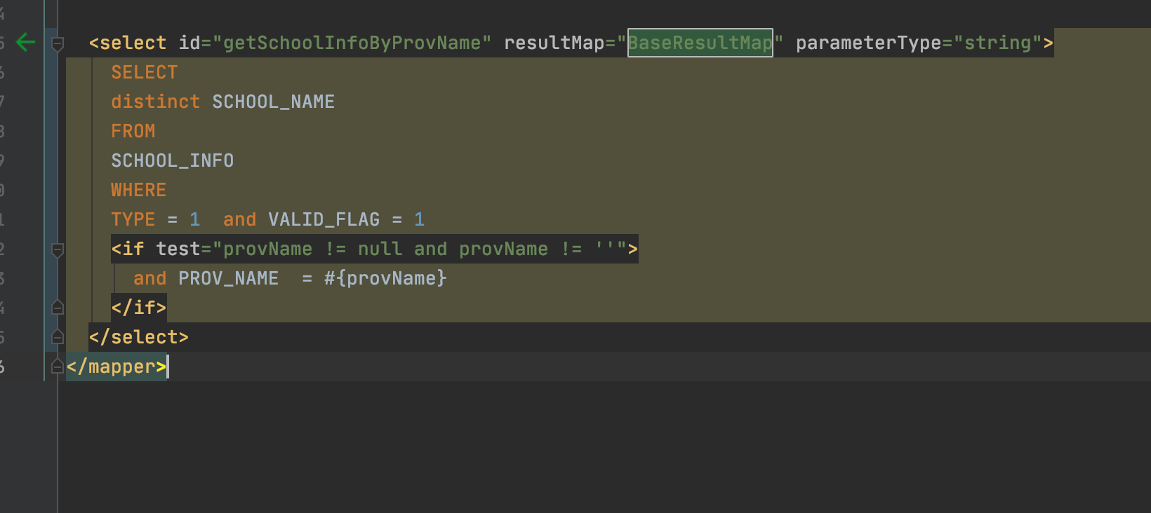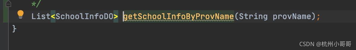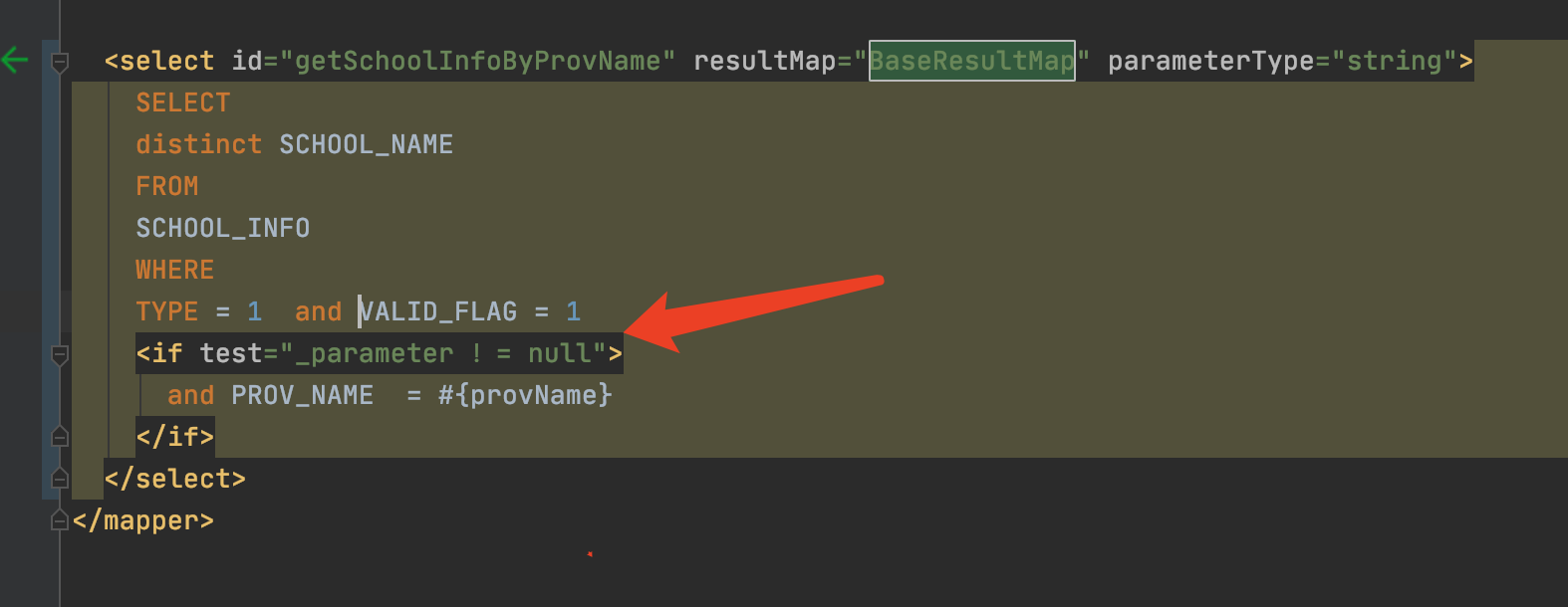 List<SchoolInfoDO> getSchoolInfoByProvName(String provName);也就是说,传递的参数名为provName,正常情况下,这样的配置合情合理。 <when test="provName != null">,你有一个对应的test判断语句,也可能是if。 那么这个时候,项目运行该查询语句时,就会抛出There is no getter for property named 'username' in 'class java.lang.String'错误!