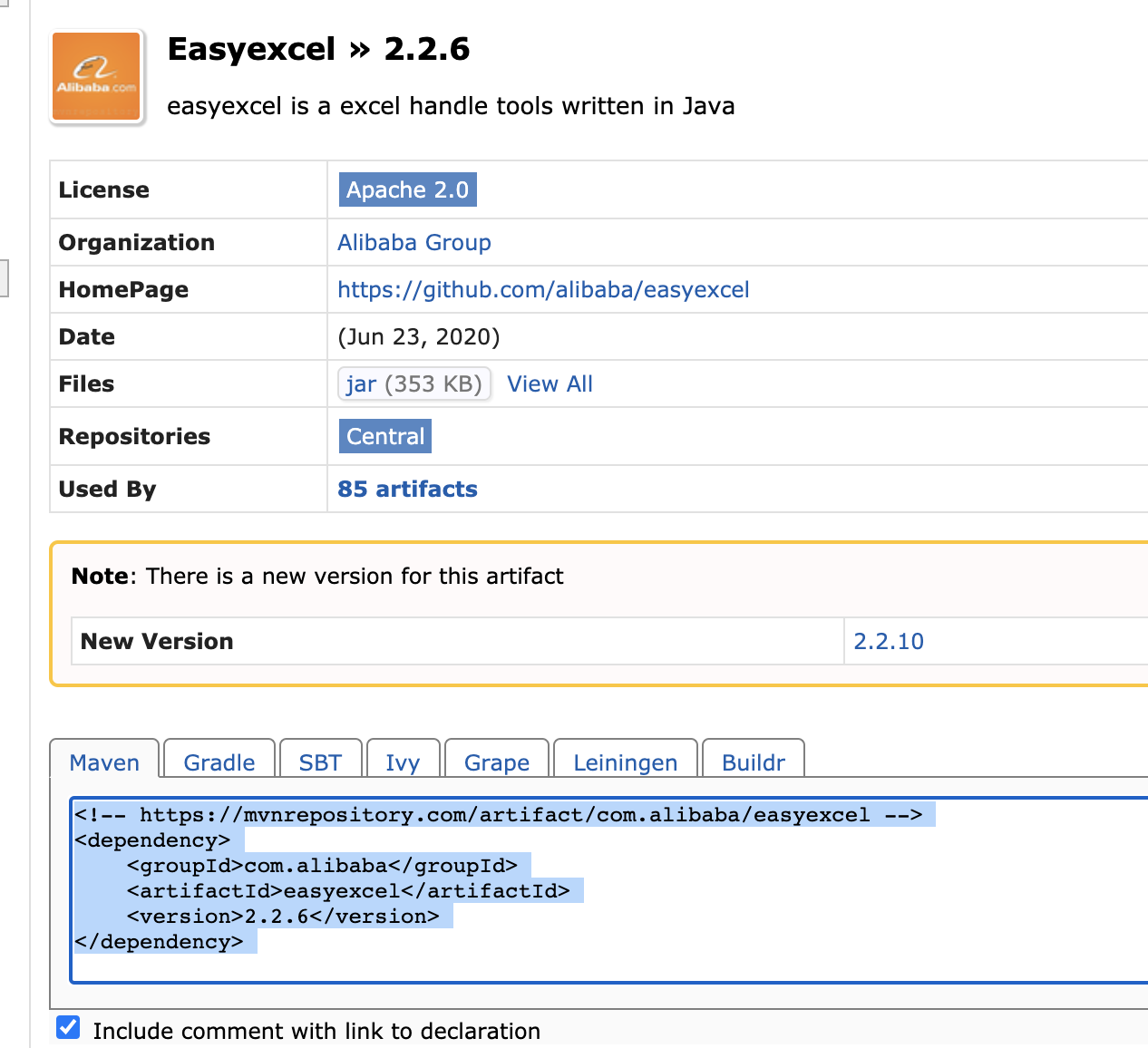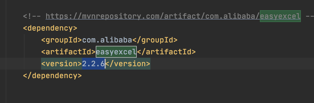 <!-- https://mvnrepository.com/artifact/com.alibaba/easyexcel --><dependency><groupId>com.alibaba</groupId><artifactId>easyexcel</artifactId><version>2.2.6</version></dependency>
