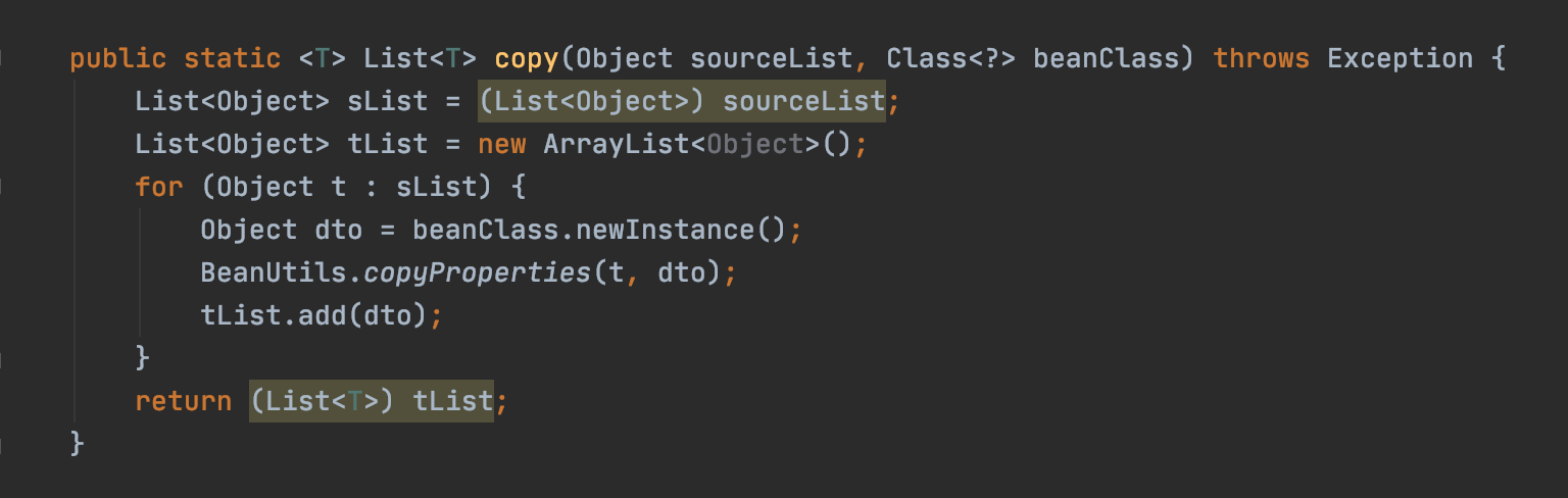 public static <T> List<T> copy(Object sourceList, Class<?> beanClass) throws Exception {List<Object> sList = (List<Object>) sourceList;List<Object> tList = new ArrayList<Object>();for (Object t : sList) {Object dto = beanClass.newInstance();BeanUtils.copyProperties(t, dto);tList.add(dto);}return (List<T>) tList;}List<DTO> dtoList = copy(doList,DTO.class);