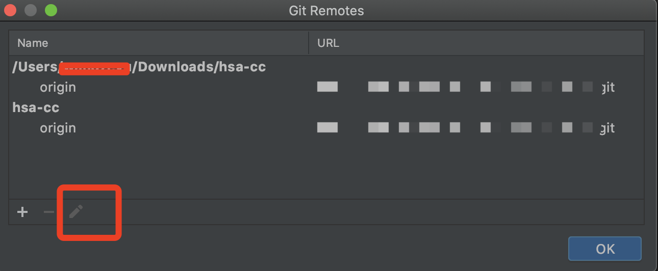 点击铅笔(编辑),看到新的弹窗,链接已经被默认选中这时候粘贴新的git地址,点击OK即完成操作