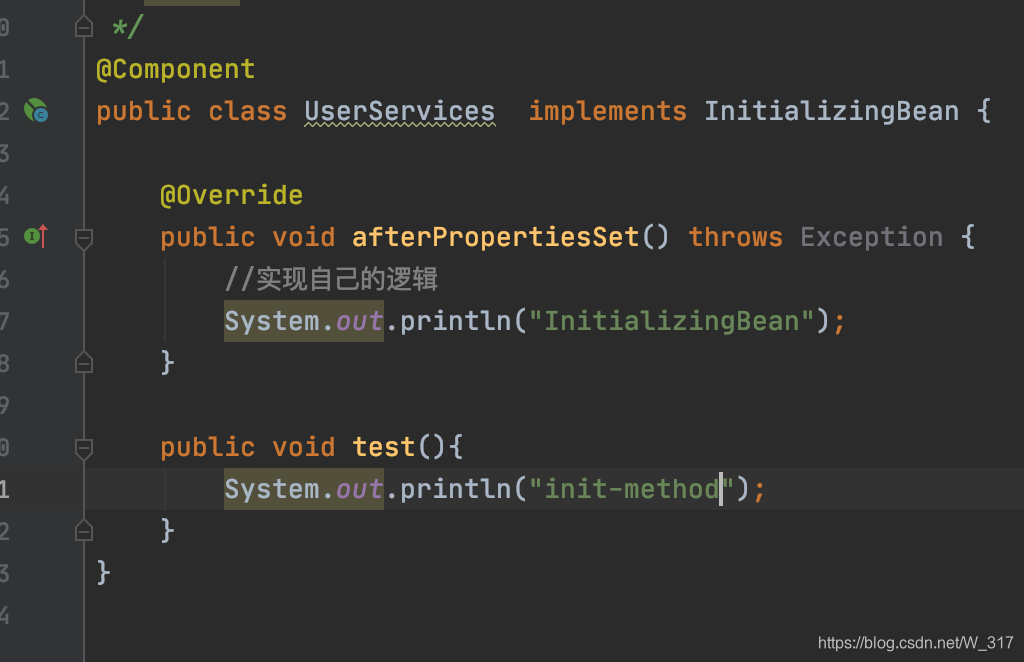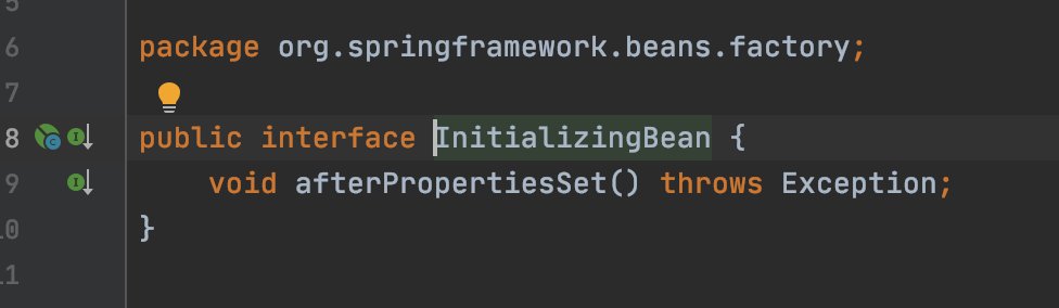 InitializingBean接口为bean提供了初始化方法的方式,它只包括afterPropertiesSet方法,凡是继承该接口的类,在初始化bean的时候会执行该方法,具体说spring初始化bean之后执行该方法