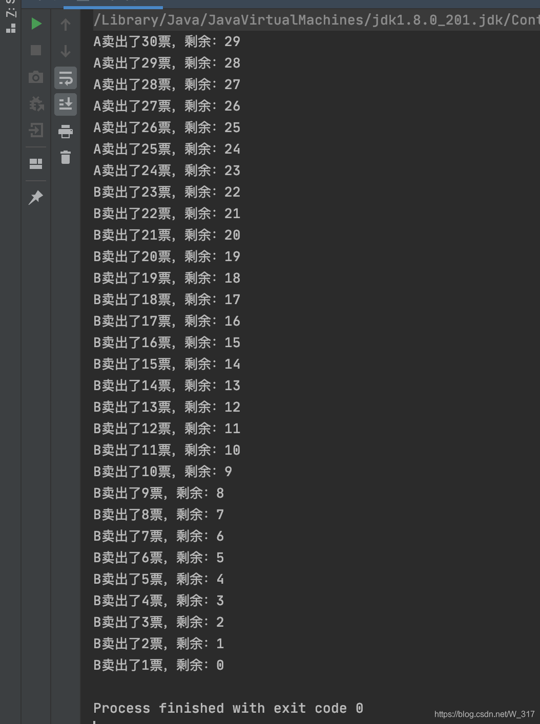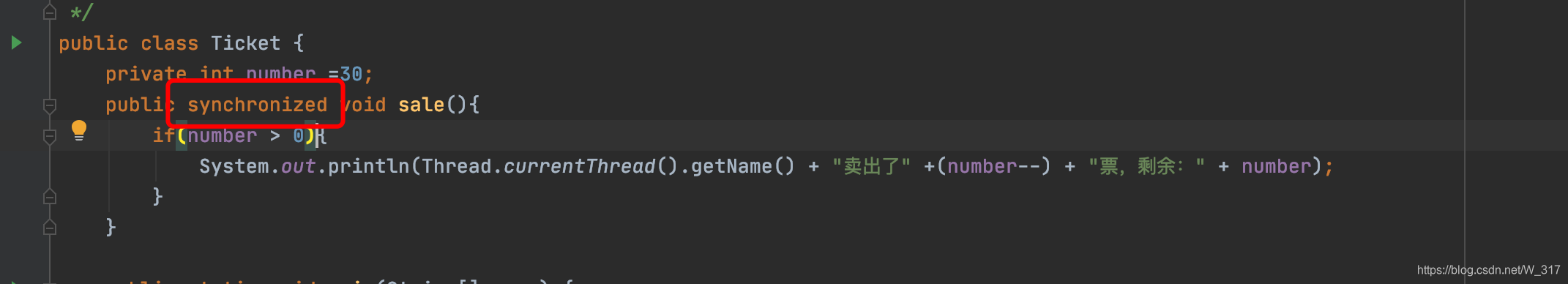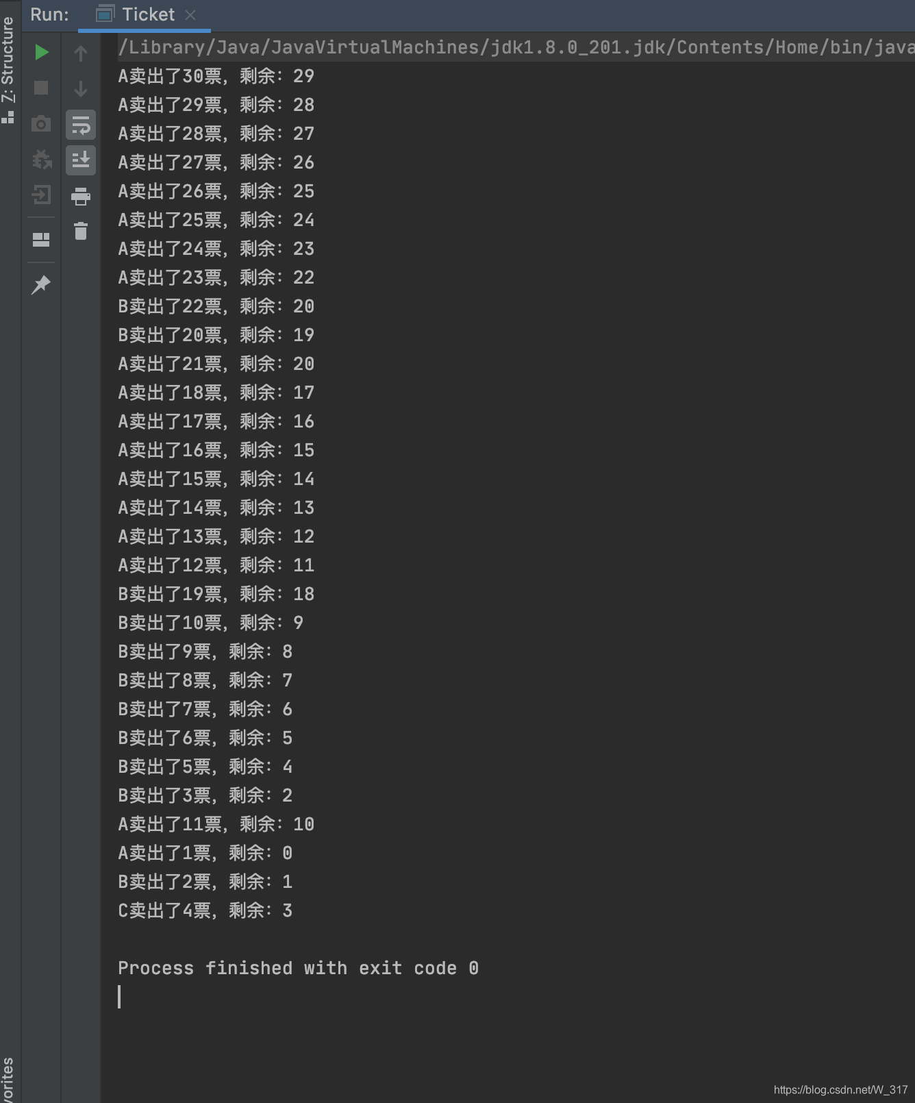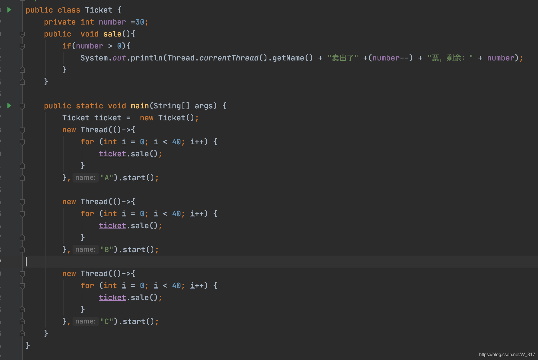public class Ticket {private int number =30;public void sale(){if(number > 0){System.out.println(Thread.currentThread().getName() + "卖出了" +(number--) + "票,剩余:" + number);}}public static void main(String[] args) {Ticket ticket = new Ticket();new Thread(()->{for (int i = 0; i < 40; i++) {ticket.sale();}},"A").start();new Thread(()->{for (int i = 0; i < 40; i++) {ticket.sale();}},"B").start();new Thread(()->{for (int i = 0; i < 40; i++) {ticket.sale();}},"C").start();}