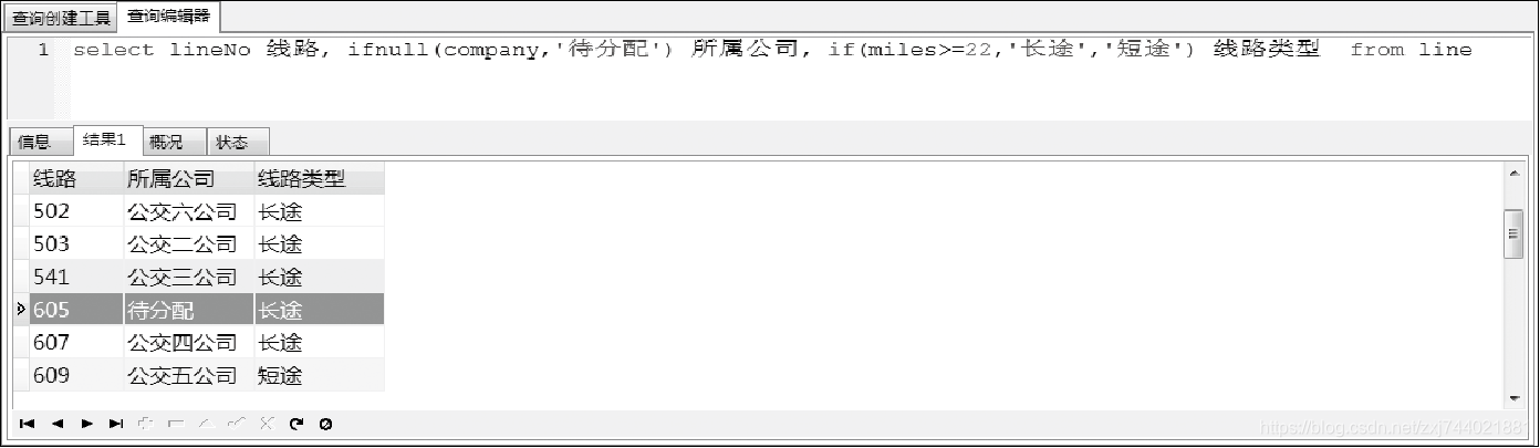 select lineNo 线路 , ifnull(company,' 待分配 ') 所属公司 ,if(miles>=22,' 长途 ',' 短途 ') 线路类型  from line素材: